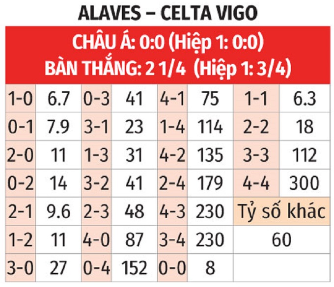 - Celta Vigo thắng châu Á: Alaves bước vào trận đấu này với thành tích thua châu Á 3/4 trận gần đây tại La Liga. Với Celta Vigo, đội bóng này thắng châu Á 3/4 trận sân khách vừa qua cùng 2 trận đối đầu mùa giải trước.