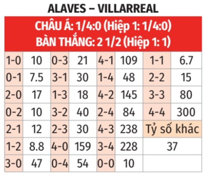 - Tối thiểu 1 bàn hiệp 1: 8/10 lần chạm trán giữa 2 đội gần đây đều có từ 1 bàn trở lên trong hiệp 1. Tình trạng tương tự xảy ra ở 6/8 trận gần đây của Alaves và 7/8 trận vừa qua của Villarreal.