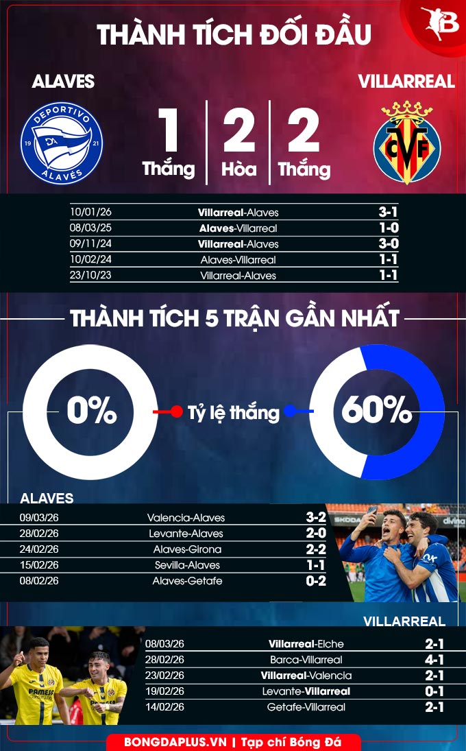Trong nỗ lực thoát xa khỏi nhóm có nguy cơ tụt hạng, Alaves sẽ tận dụng triệt để lợi thế sân nhà để hy vọng kiếm điểm trước Villarreal. Tuy nhiên, mục tiêu này không dễ thực hiện. Bởi trên thực tế, Alaves đá sân nhà cũng không tốt, cụ thể họ không thắng trong 3 lần tiếp đón các đối thủ gần nhất, trong đó phải nhận 2 thất bại.