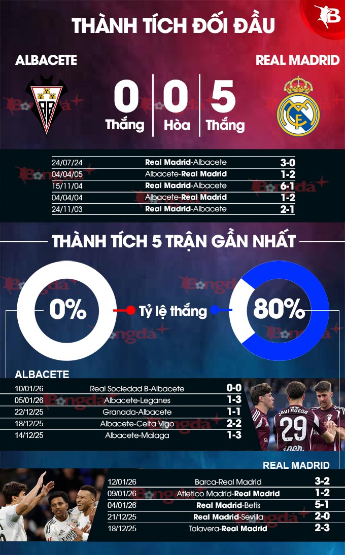 - Real Madrid giữ sạch lưới: Lối chơi của Real Madrid trong các trận đấu loại trực tiếp gần đây cho thấy rõ sự chú trọng vào việc kiểm soát trận đấu một khi họ đã dẫn trước, trong khi các bàn thắng của Albacete ở Cúp Nhà vua chủ yếu đến từ những đối thủ không quá mạnh và có nhiều khoảng trống hơn so với những gì họ có thể tìm thấy ở trận đấu khó khăn với Los Blancos.