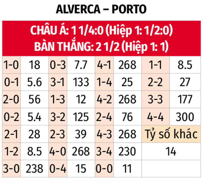 - Alverca thua châu Á hiệp 1: Các cầu thủ Alverca để thua châu Á 3 trận liên tiếp gần đây trên sân nhà ở hiệp đầu tiên tại giải VĐQG Bồ Đào Nha. Với Porto, đội khách thắng châu Á 7/10 trận vừa qua trước khi bước vào giờ nghỉ.