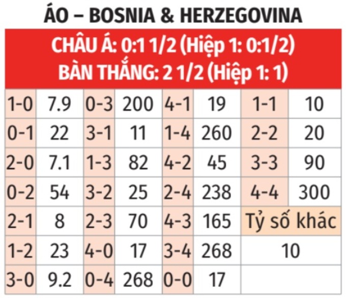 - Tối thiểu 3 bàn cả trận: Cả 6 trận đấu gần đây của Bosnia và 6/9 trận sân nhà vừa qua của Áo đều kết thúc với tối thiểu 3 bàn thắng. Trận lượt đi giữa 2 đội ở vòng loại World Cup 2026 cũng xuất hiện 3 bàn thắng.
