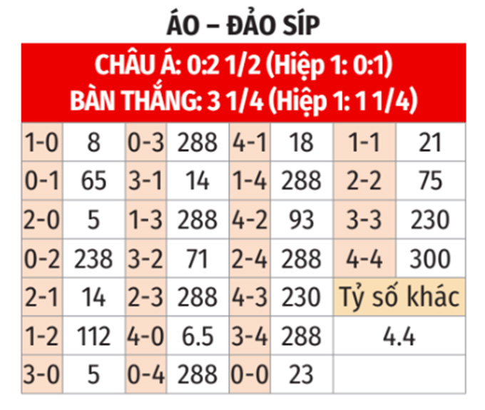 - Đảo Síp thắng theo châu á: Đảo Síp thắng 5/7 cuộc đối đầu giữa hai đội; thắng 3, hòa 1, thua 2 ở 6 trận gần đây và thắng 3/4 chuyến làm khách gần nhất. Còn Áo thua 4, hòa 2/6 trận gần nhất; thua cả 3 trận sân nhà vừa qua. Do đó, nhiều khả năng Đảo Síp sẽ đem lại nụ cười chiến thắng cho những người yêu mến họ ở trận này.