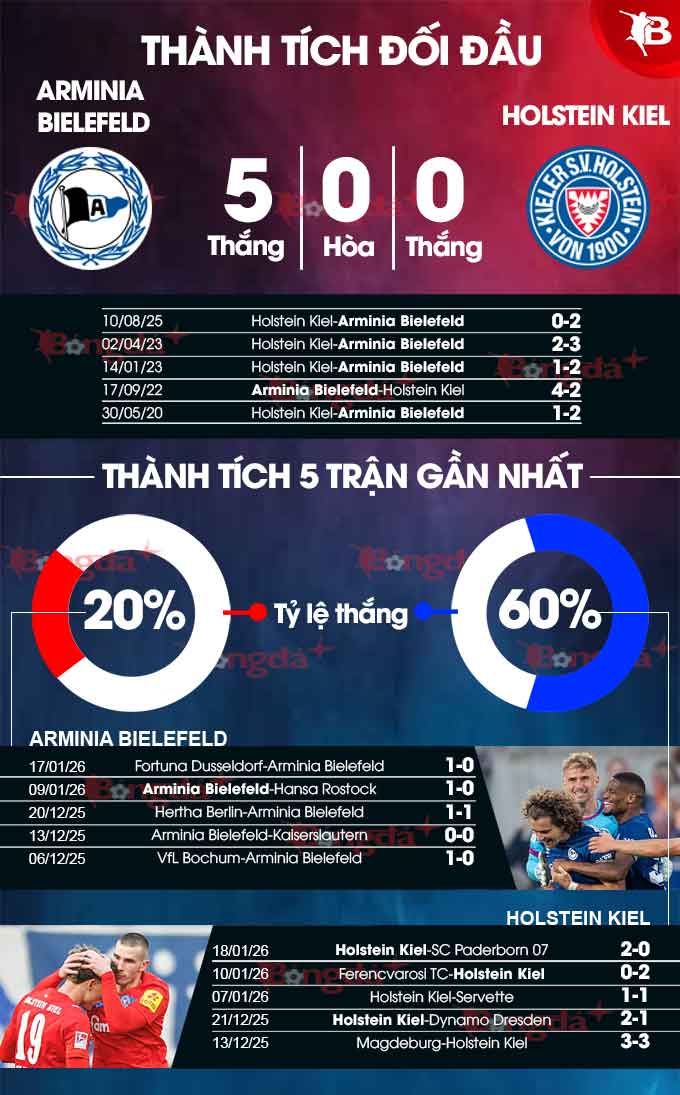 Thật vậy, nếu xét về thành tích đối đầu thì Arminia Bielefeld đang được lịch sử hoàn toàn ủng hộ, còn Holstein Kiel thì không. Với việc đã toàn thắng trong cả 8 trận gần nhất 2 đội gặp nhau, sẽ chẳng bất ngờ nếu Arminia Bielefeld buộc chuỗi trận bất bại liên tiếp của Holstein Kiel phải dừng lại.
