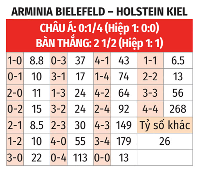 - Tối đa 2 bàn: Cả 5 trận gần đây của Arminia Bielefeld đều chỉ có tối đa 2 bàn. 6/8 trận vừa qua của Holstein Kiel số lần lưới rung cũng không lên được tới 3.