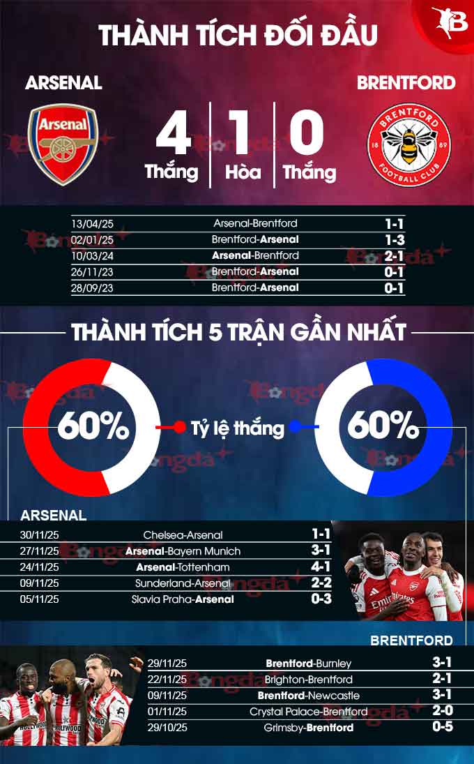 Cần nhấn mạnh, Arsenal đã thắng 6 trong 7 trận sân nhà gần nhất tại Ngoại hạng Anh (hòa 1), bao gồm chuỗi 3 trận gần nhất. Và nếu tính trên mọi đấu trường, Pháo thủ đã thắng giòn giã 10 trận, hòa 1 ở 11 trận vừa qua tại Emirates mùa này. Hơn nữa, "Bầy ong" đang có 2 thất bại gần đây trên sân khách tại Premier League 2025/26. Xem ra, nhiều khả năng Arsenal cũng thắng nhẹ nhàng trước Brentford ở trận này để tiếp tục độc chiếm ngôi đầu.