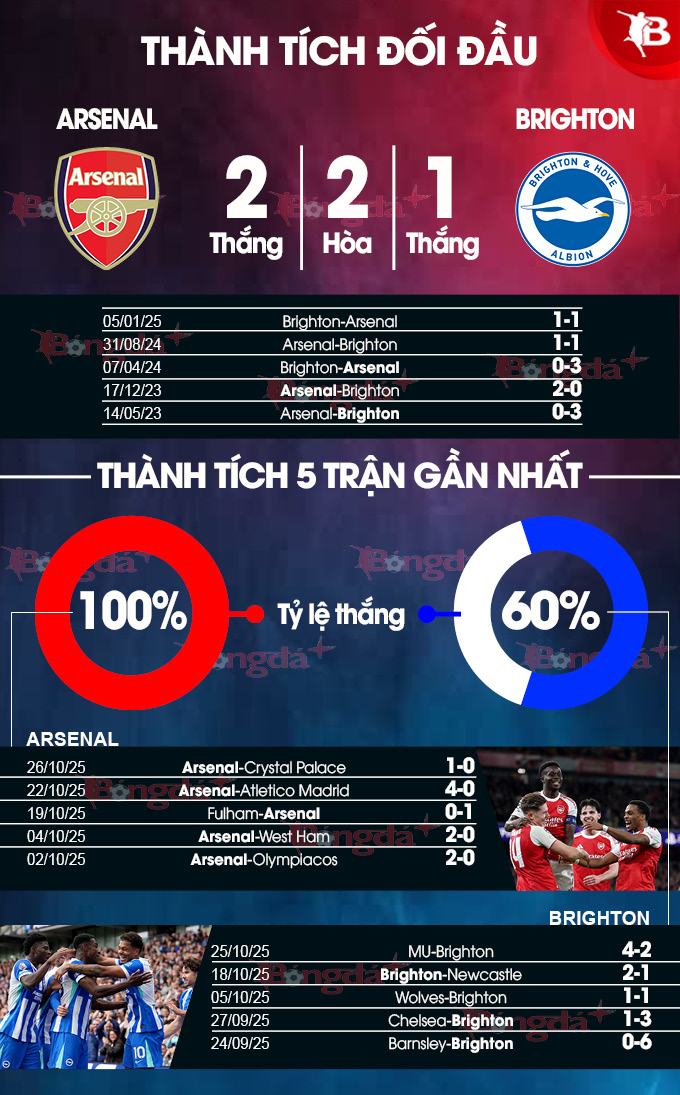 Trong khi đó, Brighton vừa chấm dứt chuỗi 5 trận không thua (3 thắng, 2 hòa) bằng thất bại 2-4 trên sân Old Trafford của MU ở vòng 9 Ngoại hạng Anh. Đây đã là trận thứ hai liên tiếp Chim mòng biển không thể thắng khi xa nhà. Và nhiều khả năng chuỗi trận này sẽ kéo dài lên con số 3 sau chuyến làm khách tại Emirates thuộc khuôn khổ Cúp Liên đoàn 2025/26 lần này.