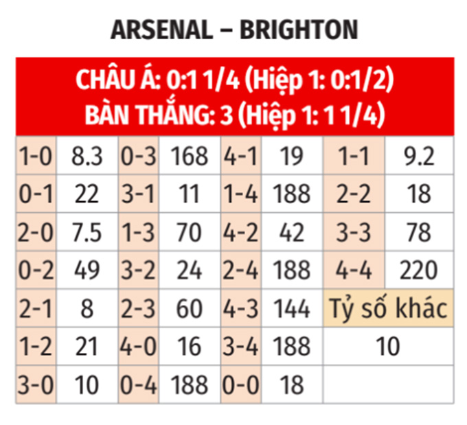Arsenal đang bây cao tại các đấu trường. Đội bóng của HLV Mikel Arteta đang dẫn đầu giải Ngoại hạng Anh và thi đấu tốt tại Champions League. Tuy nhiên, Cúp Liên đoàn mới là mục tiêu dễ dàng nhất trong hành trình chấm dứt 5 năm chờ đợi danh hiệu của The Gunners. Vì thế, có thể đặt niềm tin vào đội chủ nhà khi họ đón tiếp Brighton lần này.