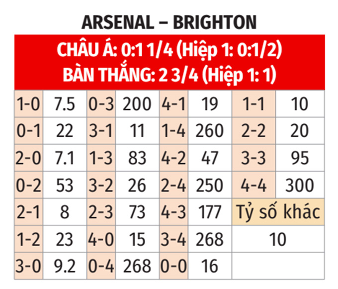 - Chẵn bàn thắng: 6/8 cuộc đối đầu gần nhất, 8/11 trận sân nhà vừa qua của Arsenal và 7/10 trận gần đây của Brighton đều khép lại với tổng bàn thắng là chẵn. Hơn nữa, 16/19 chuyến làm khách gần đây của Brighton cũng có tổng bàn thắng chia hết cho 2.