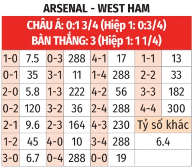 - Lẻ bàn thắng: 6/8 trận chính thức sân nhà gần đây của Arsenal và 4/5 trận mới nhất của West Ham kết thúc với tổng số bàn thắng là số lẻ. 2 trận derby London gần nhất xảy ra tình trạng tương tự.