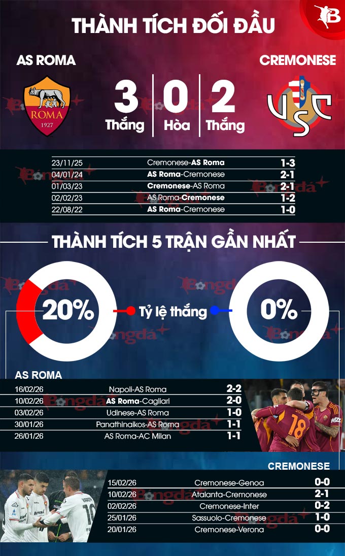 Chưa kể, đoàn quân HLV Gian Piero Gasperini cũng chỉ thắng 1 trong 4 trận đấu gần nhất tại Serie A sau khi trước đó đã có 3 chiến thắng liên tiếp trước đó. Đây rõ ràng là kết quả mà các cầu thủ AS Roma hiểu rằng họ cần phải nỗ lực rất nhiều. Và may mắn dành cho AS Roma, khi đối thủ của họ ở vòng đấu này là "con mồi" quen thuộc. Theo thống kê, AS Roma đã đánh bại Cremonese 6 trong 8 lần gặp nhau trước đó tại Rome, với trung bình 3 bàn thắng mỗi trận.