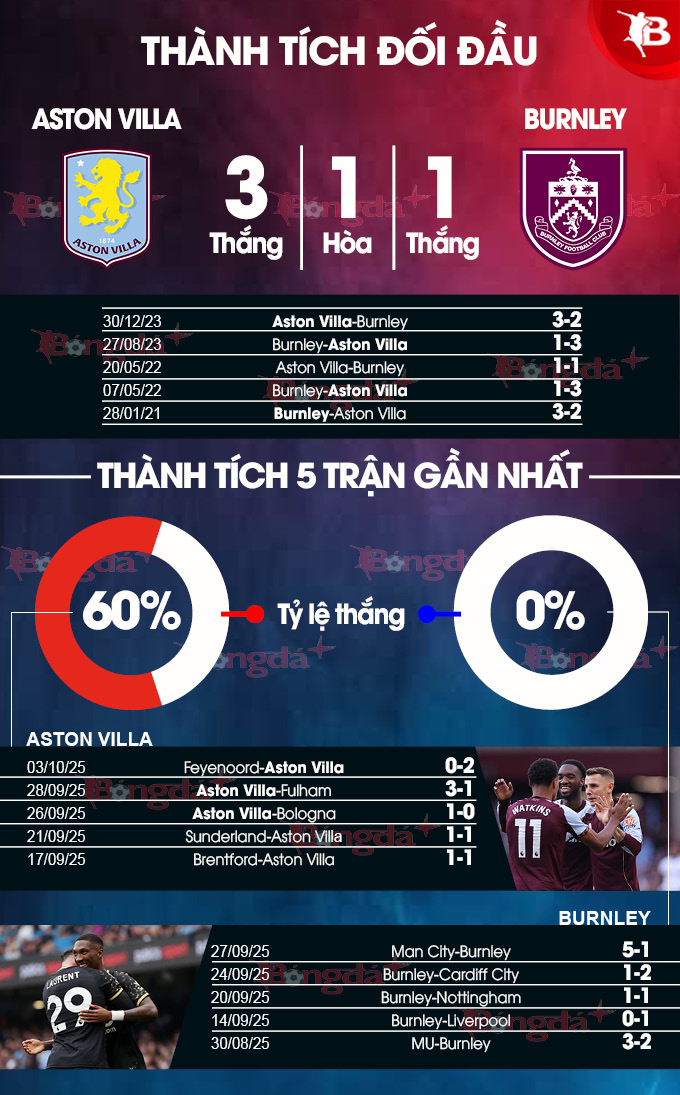 - Không đội nào giữ sạch lưới nhà: 8/10 cuộc đối đầu gần nhất và 5/6 trận gần đây của Burnley đều khép lại mà không đội nào giữ sạch được lưới nhà. Ngoài ra, 5/7 cuộc đối đầu vừa qua tại Villa Park cũng khép lại với ít nhất 1 bàn thắng cho mỗi đội.