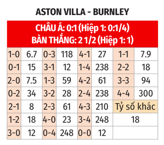 - Tối đa 1 bàn trong hiệp 1: 5/6 cuộc chạm trán gần nhất tại Villa Park, 9/10 trận gần đây của Aston Villa và 5/6 chuyến làm khách vừa qua của Burnley đều khép lại với không quá 1 bàn thắng trong hiệp 1. Kịch bản tương tự trong hiệp 1 cũng xảy ra ở 5/6 trận sân nhà gần đây.