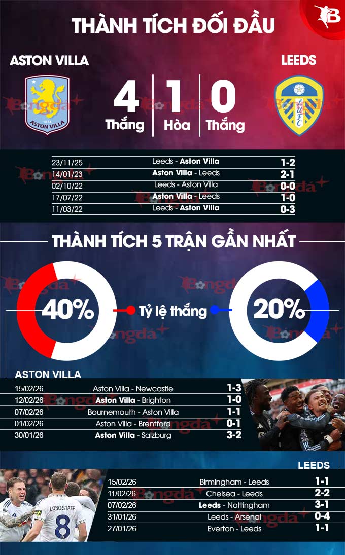 Vị trí xếp hạng cao hơn, thành tích sân nhà xuất sắc và lịch sử áp đảo trước Leeds của Villa giúp họ có cơ hội lớn để tìm kiếm 3 điểm trọn vẹn.