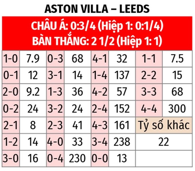 - Hai đội cùng ghi bàn: Mặc dù Aston Villa có hàng phòng ngự chắc chắn trên sân nhà, nhưng Leeds đã thể hiện khả năng tấn công nguy hiểm trong các trận đấu gần đây, trong khi khả năng tấn công của đội chủ sân Villa Park dưới thời Unai Emery cho thấy khả năng ghi bàn ở cả hai đầu sân vẫn rất cao.