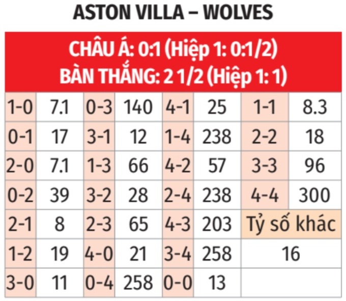 - Tối thiểu 3 bàn cả trận: 5/7 trận đấu gần đây của Aston Villa tại giải Ngoại hạng Anh đều có từ 3 bàn thắng trở lên. Tình trạng tương tự xảy ra ở 4/5 trận gần nhất của Wolves.
