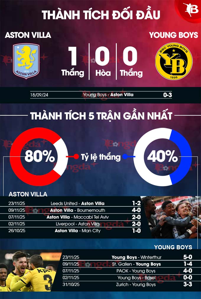 Rõ ràng Aston Villa được đánh giá cao hơn Young Boys ở cuộc đối đầu này. Với phong độ cao, sở hữu dàn cầu thủ chất lượng và cùng kinh nghiệm dẫn dắt của Unai Emery, nhiều khả năng Aston Villa sẽ giành chiến thắng để tiến gần hơn 1 suất vào thẳng vòng 16 đội.