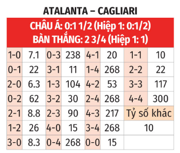 - Atalanta thắng theo châu Á: Cagliari đứng đầu Serie A mùa này về thành tích theo châu Á, họ thắng theo châu Á tới 7/8 trận chính thức gần đây trên sân khách. Trong bối cảnh đó dù vừa thắng theo châu Á 3 trận liên tiếp trên sân nhà, Atalanta nhường 1 ½ bàn vẫn là quá sâu bởi họ thực chất chỉ hơn Cagliari 2 điểm trên BXH Serie A. Đội chủ nhà sẽ thắng với cách biệt 2 bàn trở lên.