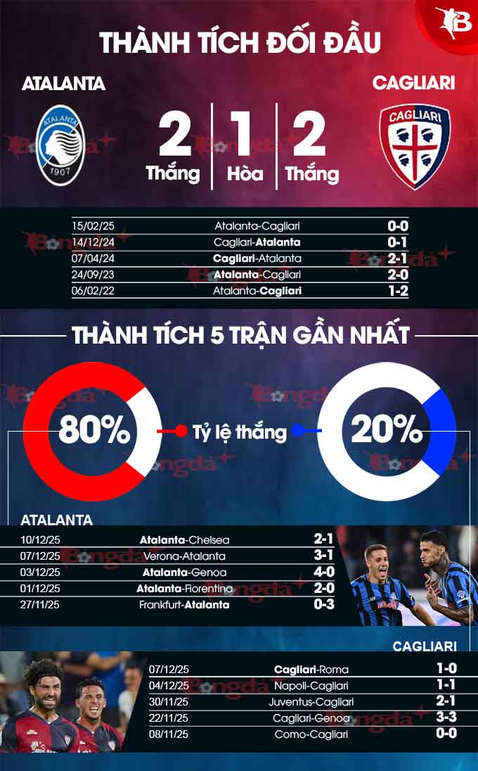 Tuy nhiên đây là thời điểm Atalanta đang đạt độ hưng phấn cao độ trên “thánh địa” Gewiss, nơi họ vừa thắng 3 trận liên tiếp và có cả thảy 8 lần phá lưới đối phương. Nghịch lý mà đội bóng thành Bergamo đang thể hiện ở 2 đấu trường quan trọng nhất sẽ phần nào được quên đi khi họ đón tiếp Cagliari.