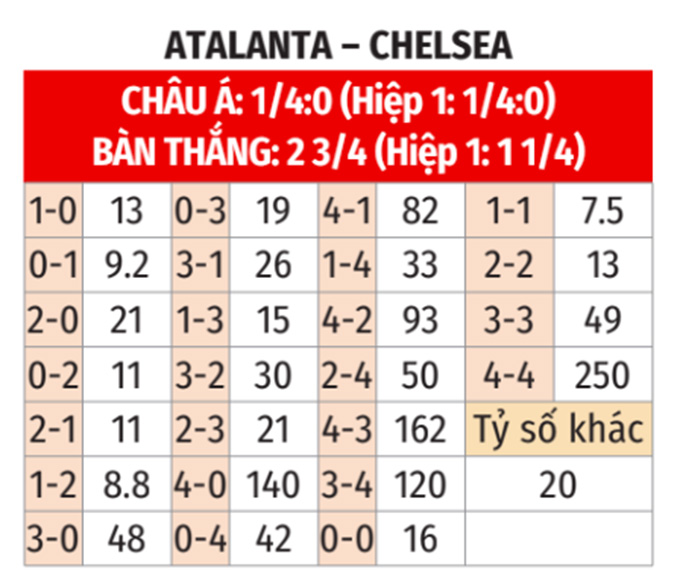 - Hiệp 1 tối đa 1 bàn: 6/8 trận gần nhất của Atalanta và 5/6 trận vừa qua của Chelsea đều có không quá 1 bàn trong hiệp đấu đầu tiên. Không những thế, 5/6 trận sân nhà gần đây của Atalanta và 5/8 chuyến làm khách vừa qua của Chelsea cũng có tối đa 1 bàn trong hiệp 1.