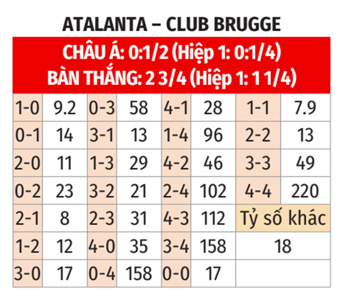 - Chẵn bàn thắng: 6/9 trận gần nhất của Atalanta và 5/8 trận vừa qua của Club Brugge đều có tổng bàn thắng là chẵn. Bên cạnh đó, 7/11 trận chính thức gần đây của Atalanta cũng có tổng bàn thắng chia hết cho 2. Trận này khó có ngoại lệ.