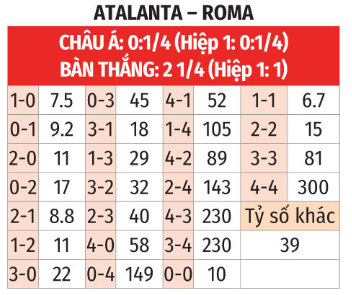 - Nhiều góc hiệp 1: 3/4 trận chính thức gần đây của Roma với tỷ lệ châu Á đúng 1/4 bàn có tối thiểu 4 góc hiệp 1. Cả 6 trận chính thức vừa qua của Atalanta đều có 4 góc trở lên trong 45 phút đầu, 4 trận đạt tối thiểu 5 góc hiệp 1. 5 lần đối đầu gần nhất tại thành phố Bergamo, số góc hiệp 1 lần lượt là 8, 4, 4, 5 và 4. Nên chờ tỷ lệ hạ xuống 3,5 rồi cổ vũ nhiều góc hiệp 1.