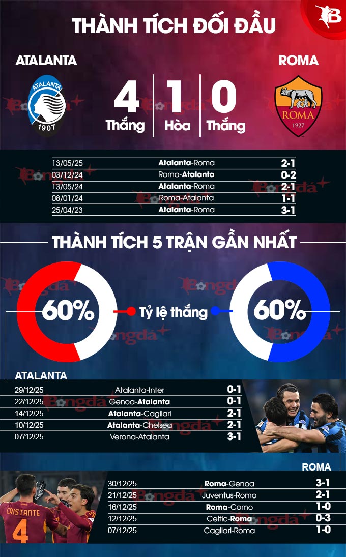 Trong 6 lần gần nhất hành quân tới Bergamo, Roma đã thua tới 5 trận. Sẽ không ngạc nhiên nếu Atalanta giành 3 điểm để cải thiện vị trí trên BXH.