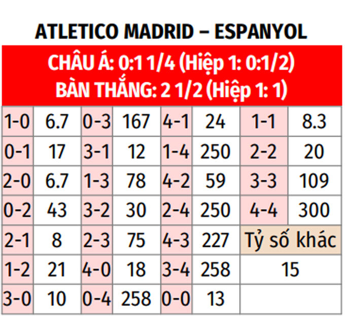 - Lẻ bàn thắng: 6/10 trận gần nhất của Atletico có tổng bàn thắng không chia hết cho 2. Ngoài ra, 6/10 trận vừa qua của Espanyol kết thúc với kết quả tương tự.