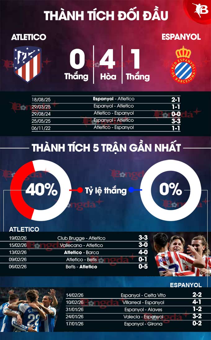 10 trận gần nhất khi tiếp Espanyol, Atletico bất bại khi thắng 6, hòa 4 ở 10 trận vừa xong. Nhiều khả năng, Atletico sẽ có chiến thắng ở trận này.