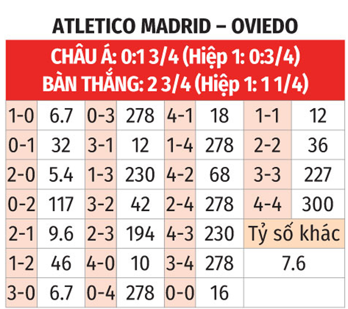 - Chẵn bàn thắng: 2 trận đối đầu trước đó giữa Atletico vs Oviedo có tổng bàn thắng chia hết cho 2. Ngoài ra, 6/10 trận vừa xong của Atletico và 7/10 trận vừa qua của Oviedo đều chứng kiến điều tương tự.
