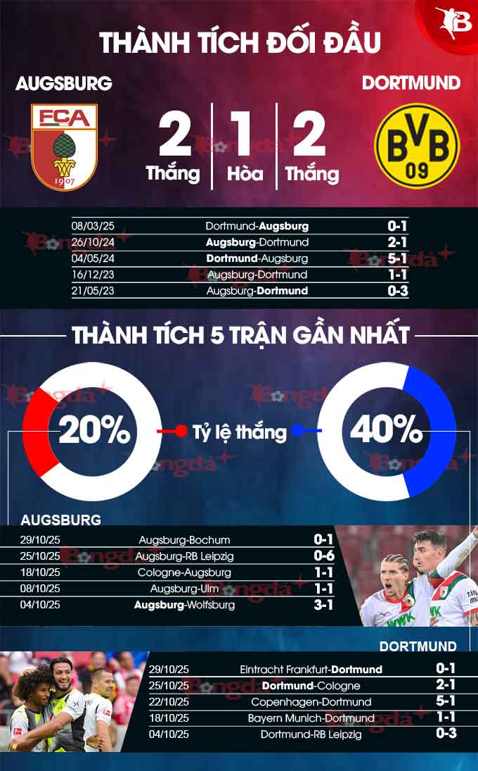 - Hiệp 1 có bàn thắng: 4/5 trận vừa qua của Augsburg và 7/8 trận gần đây của Dortmund đều xuất hiện ít nhất 1 bàn thắng trong hiệp đầu tiên. 9/10 trận đối đầu gần nhất cũng có bàn thắng trước giờ nghỉ, với 6 trận trong số đó có tối thiểu 2 bàn.
