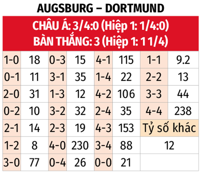 - Ít bàn thắng: 3/4 trận gần đây của Augsburg cùng 2 trận liên tiếp vừa qua của Dortmund đều có tối đa 2 bàn thắng. Trận đối đầu gần nhất giữa đôi bên cũng chỉ xuất hiện 1 bàn thắng.