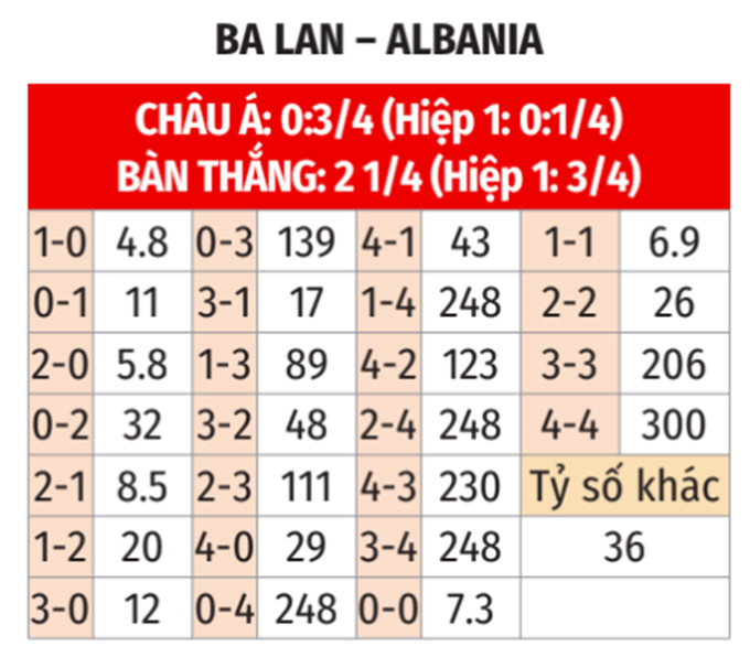 - Lẻ bàn thắng: 5/6 cuộc đối đầu gần nhất, cả 4 trận đụng độ gần đây tại Ba Lan và 3/4 trận chính thức vừa qua của Albania đều có tổng bàn thắng là lẻ. Đặc biệt, cả 3 trận làm khách vừa qua của Albania cũng có tổng bàn thắng không chia hết cho 2.