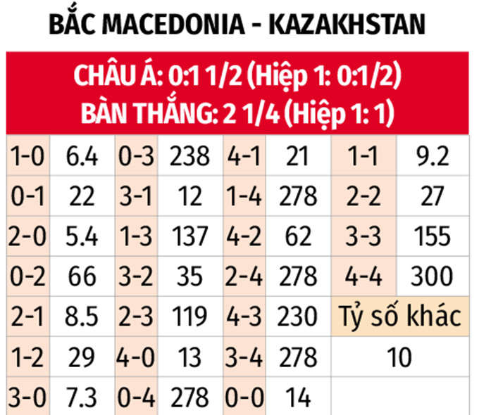 - Bắc Macedonia thắng châu Á hiệp 1: Kazakhstan để thua châu Á 3/4 trận gần đây trong 45 phút đầu tiên. Bắc Macedonia lại toàn thắng theo châu Á 3 trận vừa qua tại vòng loại World Cup trước khi bước vào giờ nghỉ. Chưa kể, 2 trận đối đầu gần nhất Bắc Macedonia cũng thắng 1-0 ngay trong hiệp một.