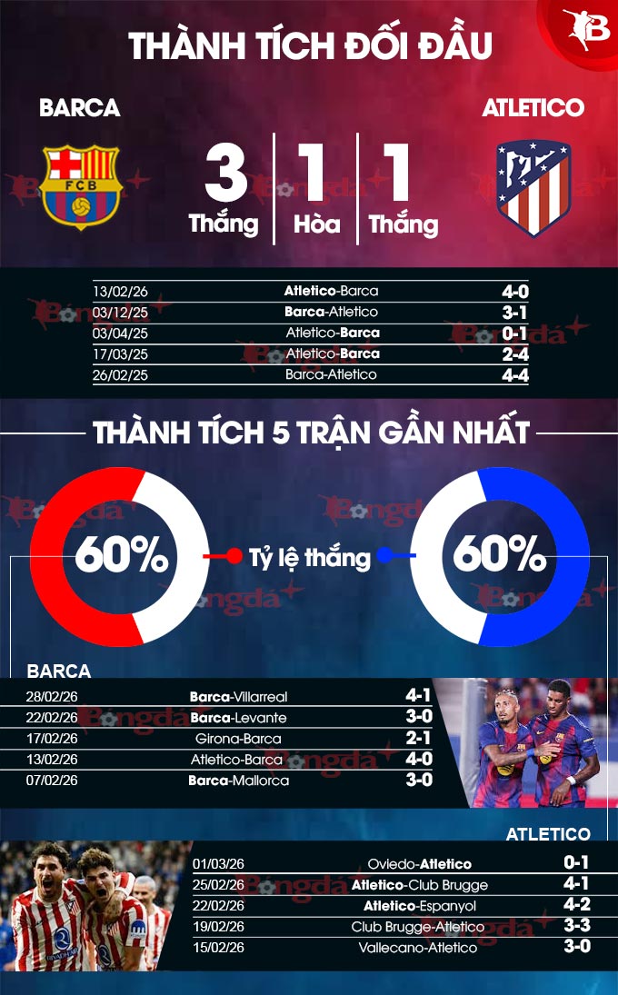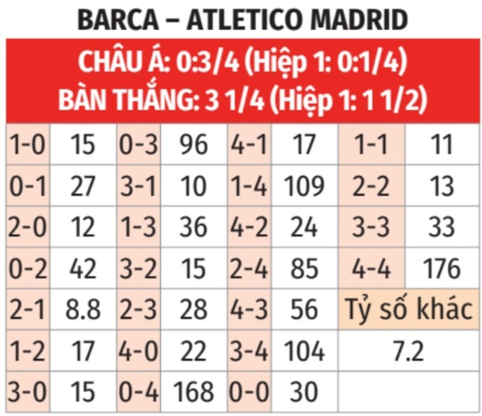 - Tối thiểu 2 bàn hiệp 1: 3/4 trận đấu gần đây của Barca và 6/8 trận vừa qua của Atletico đều xuất hiện ít nhất 2 bàn thắng ở hiệp đầu. Tình trạng tương tự xảy ra ở 2 lần chạm trán gần nhất giữa 2 đội.