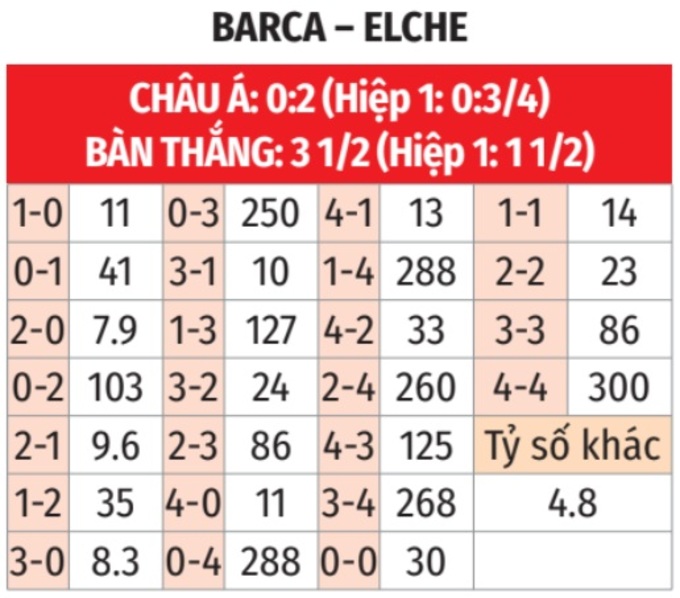 - Tối thiểu 2 bàn hiệp 1: 3/4 lần gặp giữa 2 đội gần đây trên sân của Barca tại các giải chính thức đều có từ 2 bàn thắng trở lên trong hiệp 1. Tình trạng tương tự xảy ra ở 6 trận đấu vừa qua của Barca và trận gần đây nhất của Elche.