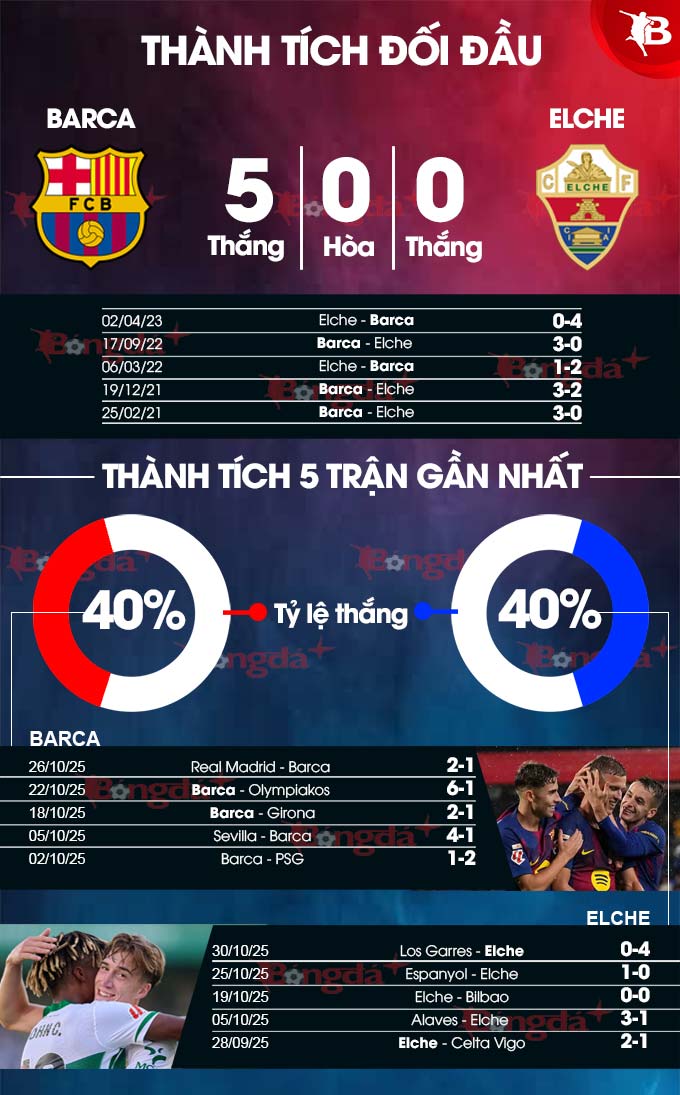 Elche cũng không xứng tầm đối thủ của Barca. Những con số thống kê chỉ ra điều đó. Cụ thể, trong 13 lần đối đầu giữa 2 đội gần đây tính trên mọi đấu trường, đội bóng xứ Catalunya áp đảo với thành tích hòa 1 và thắng 12 trận. Trong đó, ở 2 trận lượt đi và về La Liga mùa trước, Barca đều khiến Elche thua với cách biệt từ 3 bàn trở lên.