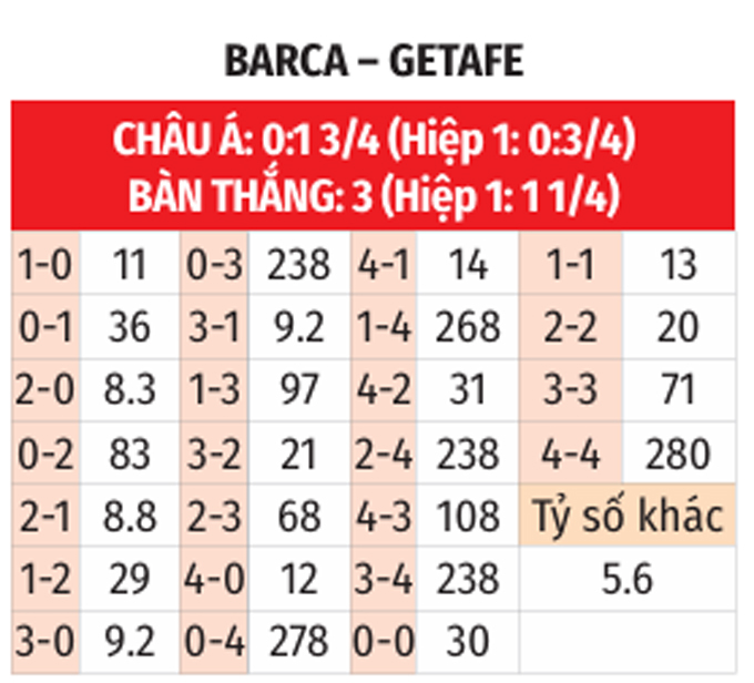 Trong khi đó, Getafe thắng 3/7 trận gần nhất khi xa nhà. Ngoài ra, đẳng cấp và thành tích đối đầu vượt trội của Barca trước Getafe trong thời gian gần đây (thắng 5, hòa 4) là điểm tựa để tin rằng đội chủ nhà sẽ có 3 điểm ở trận này.