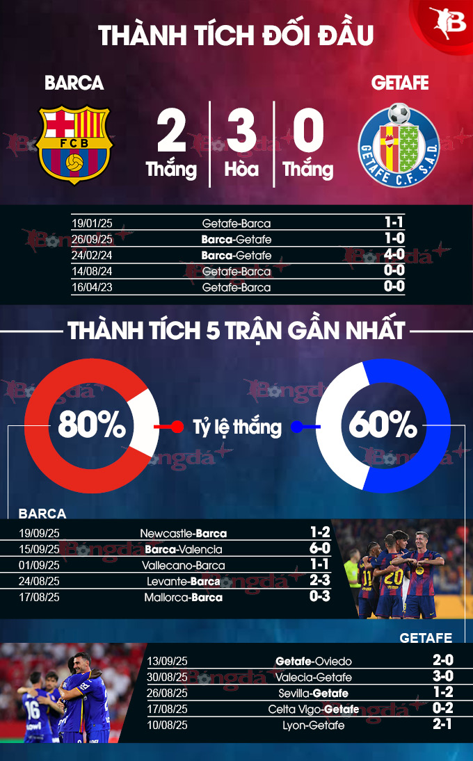 Phong độ của Barca vs Getafe đang có nhiều chênh lệch. Cụ thể, trong khi Barca bất bại ở 6 trận gần nhất thì Getafe chỉ thắng 3 ở cùng thời gian. Chưa hết, Barca có lợi thế sân nhà và có kết quả rất ấn tượng tại đây, khi chỉ thua 1/15 trận gần nhất. Hơn nữa, họ lại còn đang thăng hoa với tâm lý thoải mái sau khi khởi đầu như mơ ở vòng phân hạng Champions League 2025/26 bằng thắng lợi 2-1 trước Newcastle.
