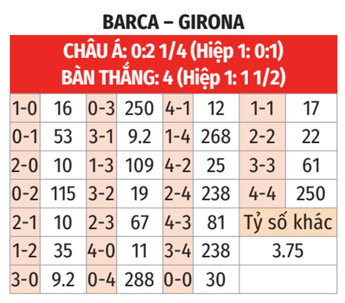 - Trên 1 bàn hiệp 1: 3/4 trận gần đây giữa Barca và Girona đều có tối thiểu 2 bàn trong hiệp 1. Điều tương tự cũng diễn ra ở 4/5 trận vừa qua của Barca.