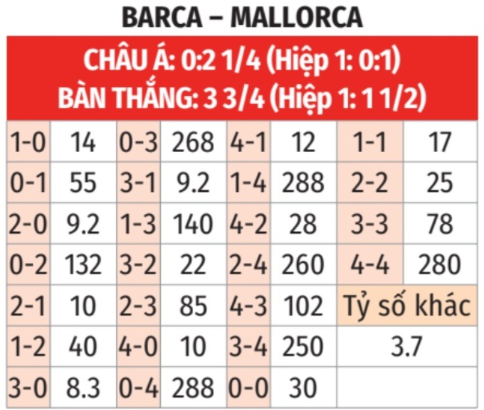 - Tối đa 1 bàn hiệp 1: 3/4 lần gặp giữa 2 đội gần đây trên sân của Barca đều chỉ có tối đa 1 bàn hiệp 1. Tình trạng tương tự xảy ra ở 5/7 trận gần đây của Barca và 4/5 trận sân khách mới nhất của Mallorca.