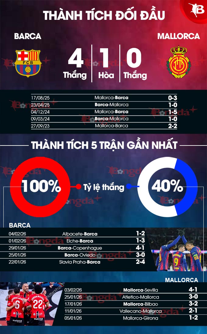 Trong khi đó, Mallorca đang kém Barca tới 13 bậc tại bảng xếp hạng La Liga. Kể từ đầu mùa giải đến giờ, đội bóng xứ đảo mới giành được 6 chiến thắng, trong khi phải nhận đến 10 thất bại. Với phong độ ấy, rất khó để họ làm nên bất ngờ trên sân của đối thủ đang được xem là ứng cử viên nặng ký cho chức vô địch La Liga mùa này.