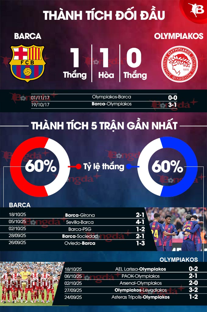 Đại diện Hy Lạp hòa không bàn thắng trên sân nhà trước đối thủ yếu Pafos ở trận mở màn trước khi thua 0-2 trên sân khách trước Arsenal. Những kết quả này cho thấy sự chật vật của họ trong việc ghi bàn ở cấp độ cao nhất của bóng đá châu lục. Làm khách tới xứ Catalunya trong bối cảnh để thua 2/3 trận sân khách gần đây sẽ là thử thách khó khăn dành cho Olympiakos.