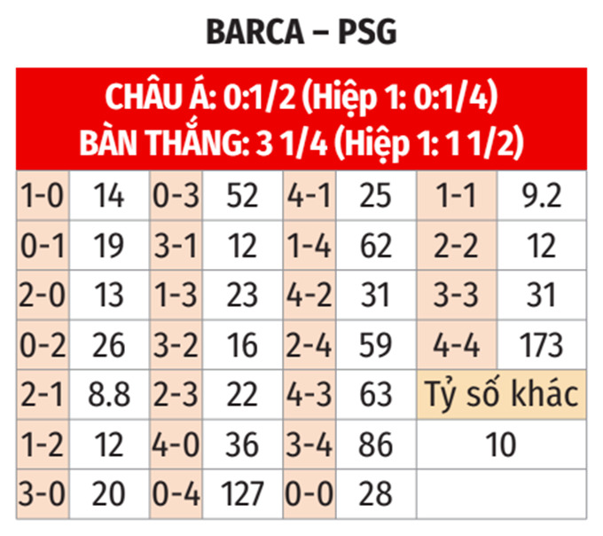 - Hiệp 1 ít nhất 2 bàn: 8/11 trận đối đầu gần nhất giữa hai đội đều có ít nhất 2 bàn thắng trong hiệp 1. Ngoài ra, 10/14 trận gần đây của Barca và 2 trận vừa qua tại Champions League của PSG đều có từ 2 bàn trở lên trong hiệp đấu đầu tiên. Hơn nữa, 6/7 trận sân nhà vừa qua của Barca cũng đều có kịch bản tương tự trong hiệp 1.