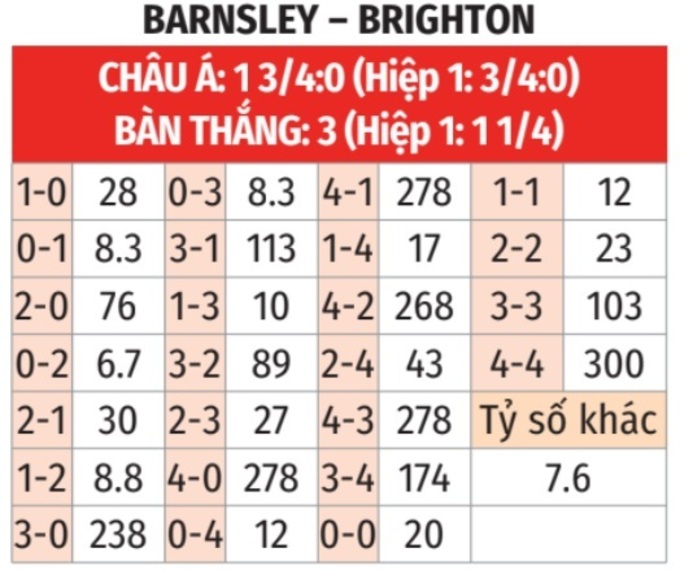 - Ít bàn thắng hiệp 1: 7/8 lần đối đầu giữa 2 đội gần đây có không quá 1 bàn thắng trong hiệp 1. 5/7 trận gần đây của Barnsley và 6/8 trận mới nhất của Brighton tương tự.