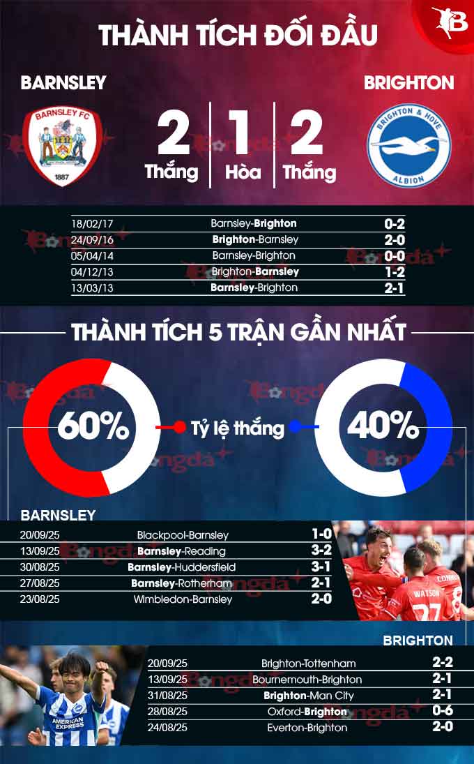 - Ít bàn thắng cả trận: 3 lần đối đầu giữa 2 đội gần đây đều có không quá 2 bàn thắng. 5/7 trận gần đây của Barnsley và 6/8 trận vừa qua của Brighton xảy ra tình trạng tương tự.