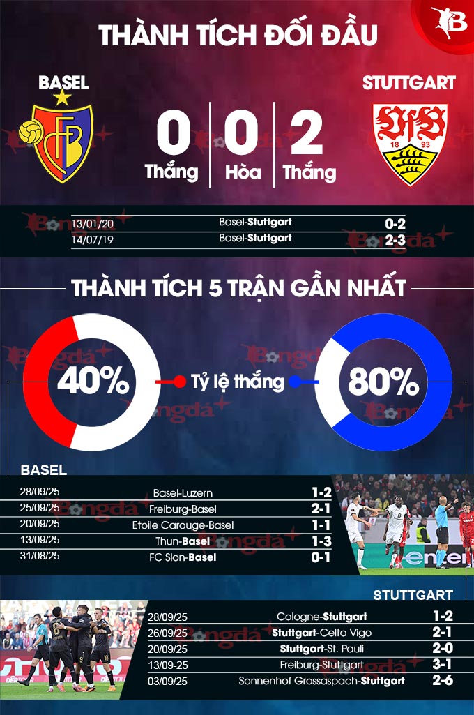 Xin lưu ý, đây đã thăng lợi thứ 5 của Stuttgart trong 6 trận gần đây. Với thành tích ấn tượng như vậy, Stuttgart đủ khả năng kiếm trọn 3 điểm từ tay Basel vốn là đội bóng không được lịch sử ủng hộ. Nếu viễn cảnh trên trở thành sự thật, thì Basel luôn phải nhận thất bại trong cả 2 lần chạm trán Stuttgart.
