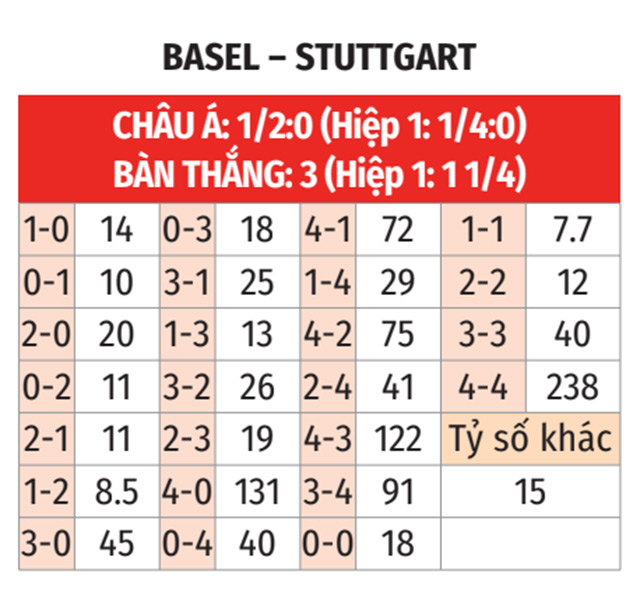 - Stuttgart thắng theo châu Á: Basel thua theo châu Á ở 5/7 trận gần nhất. Đá với Stuttgart thắng theo châu Á ở 5/6 trận vừa qua, đội chủ nhà không phải là sự lựa chọn đáng tin cậy.