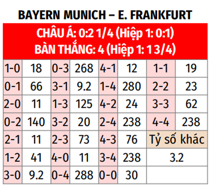 - Chẵn bàn thắng: 4/6 trận so T gần nhất giữa 2 CLB có tổng bàn thắng chia hết cho 2. Chưa hết, 6/10 trận vừa qua của Bayern Munich lẫn 7/10 trận mới nhất của Frankfurt chứng kiến điều tương tự.