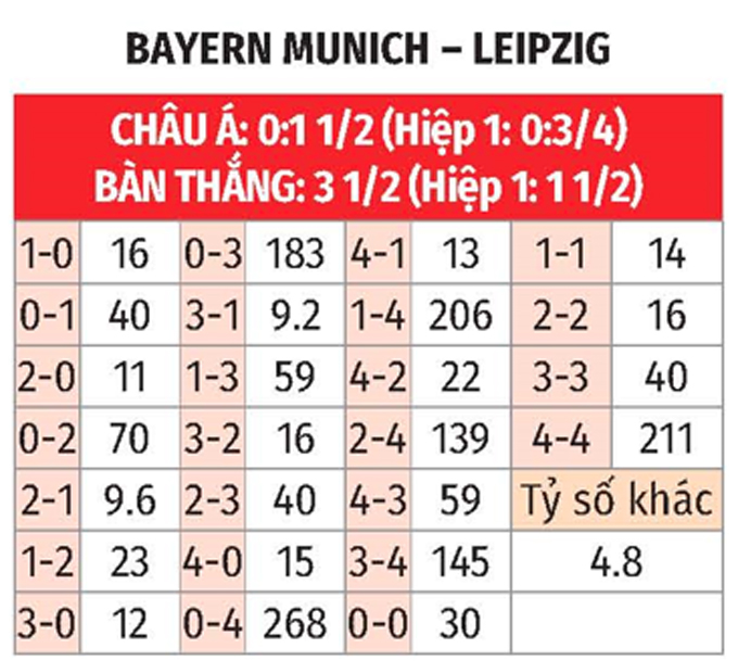 - Bayern Munich ghi bàn hiệp 1: Bayern đã ghi ít nhất 1 bàn trong hiệp 1 ở 7/10 trận gần nhất. Đặc biệt, Bayern còn làm được điều đó trong 6/10 lần so T gần đây với Leipzig trên mọi đấu trường.